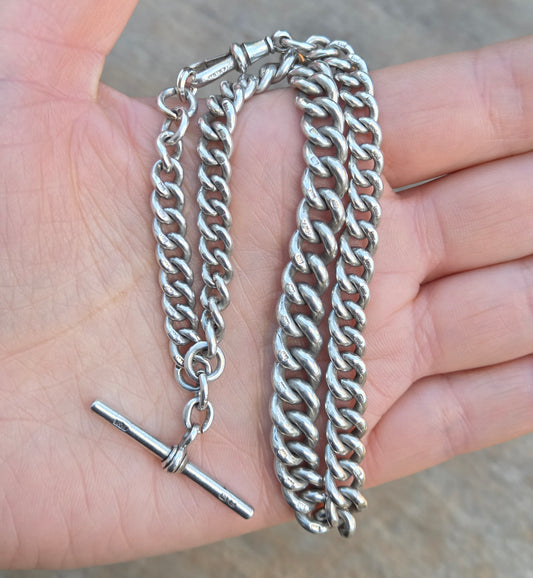 Antique 1894 Hallmarked Solid Sterling Silver Single Albert Curb Chain T Bar Fob 11.2'' 59g