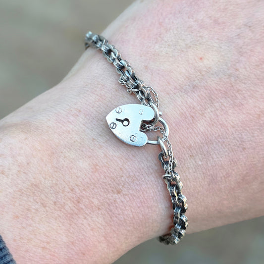 Antique Solid Sterling Silver Fancy Link Heart Padlock Chain Bracelet 7.75'' 8g