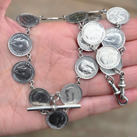 Antique Hallmarked Solid Silver Threepenny Coin Double Albert Watch Chain Necklace 33g