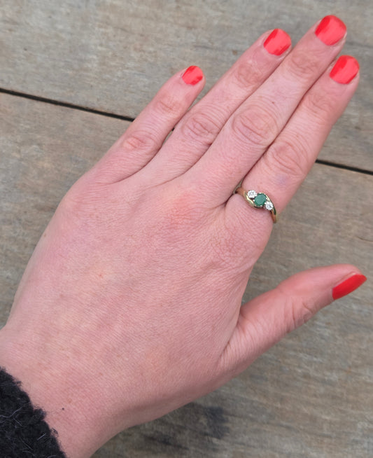 Vintage English Hallmarked Solid 9ct 9k Gold Emerald Diamond Trilogy Ring Size N