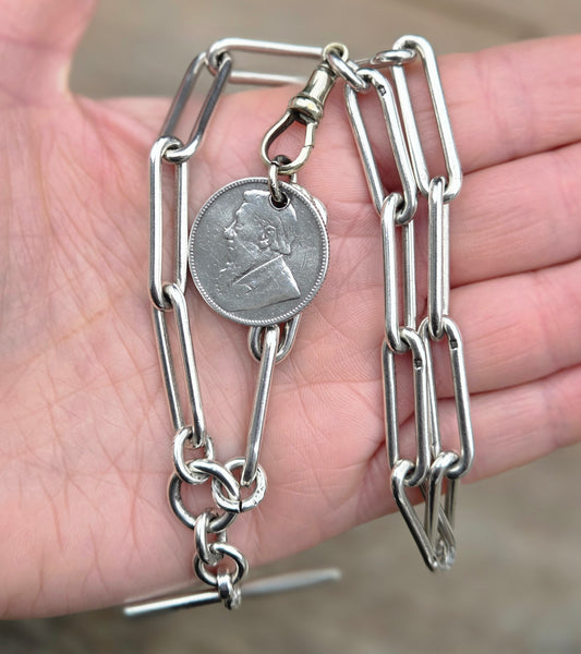 Antique Hallmarked Solid Sterling Silver Trombone Albert Chain Necklace Coin Fob 15'' 52g