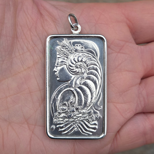 Vintage Pamp Suisse Solid 999 Fine Silver Lady Fortuna Ingot with Sterling Pendant