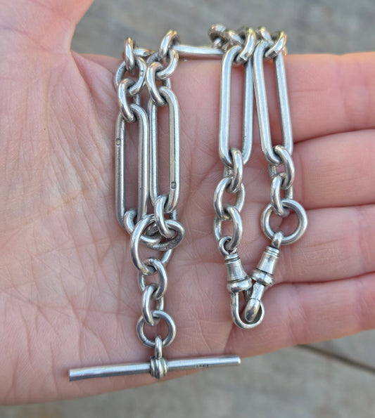Antique 1921 Hallmarked Solid Sterling Silver Trombone Double Albert Chain Necklace 14.25'' 58g