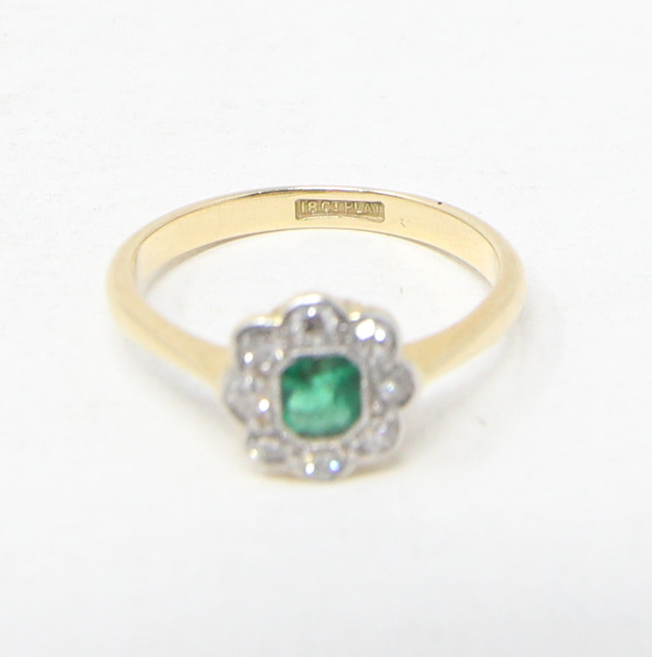 Antique Art Deco hallmarked solid 18ct gold emerald & diamond ring in a size M.