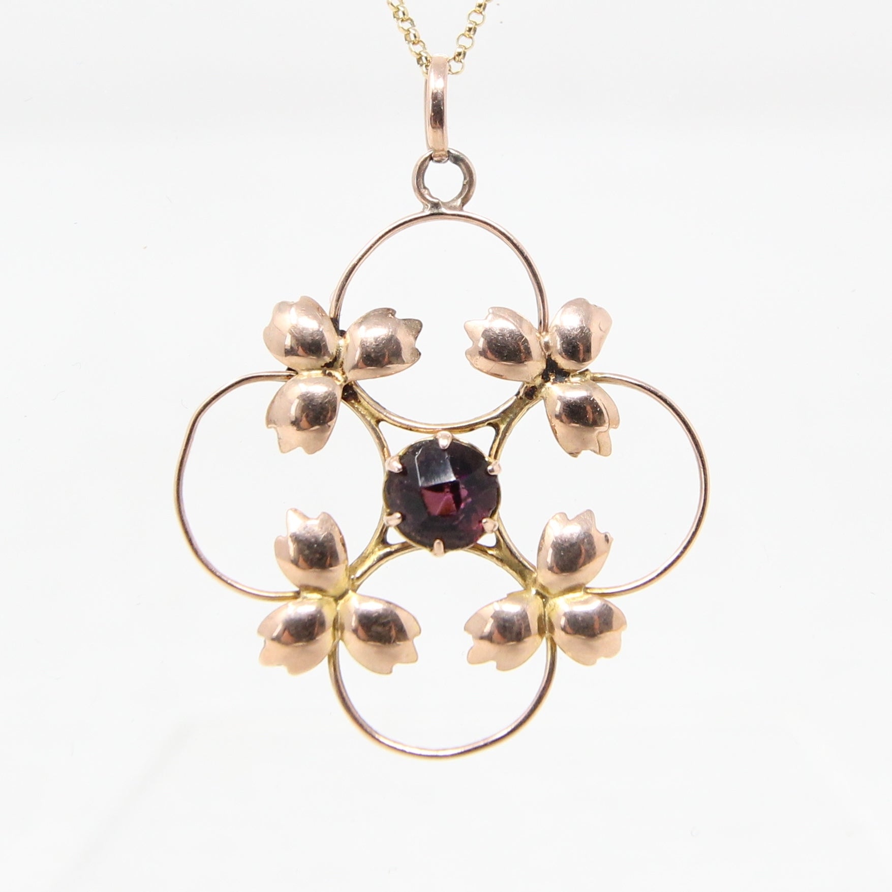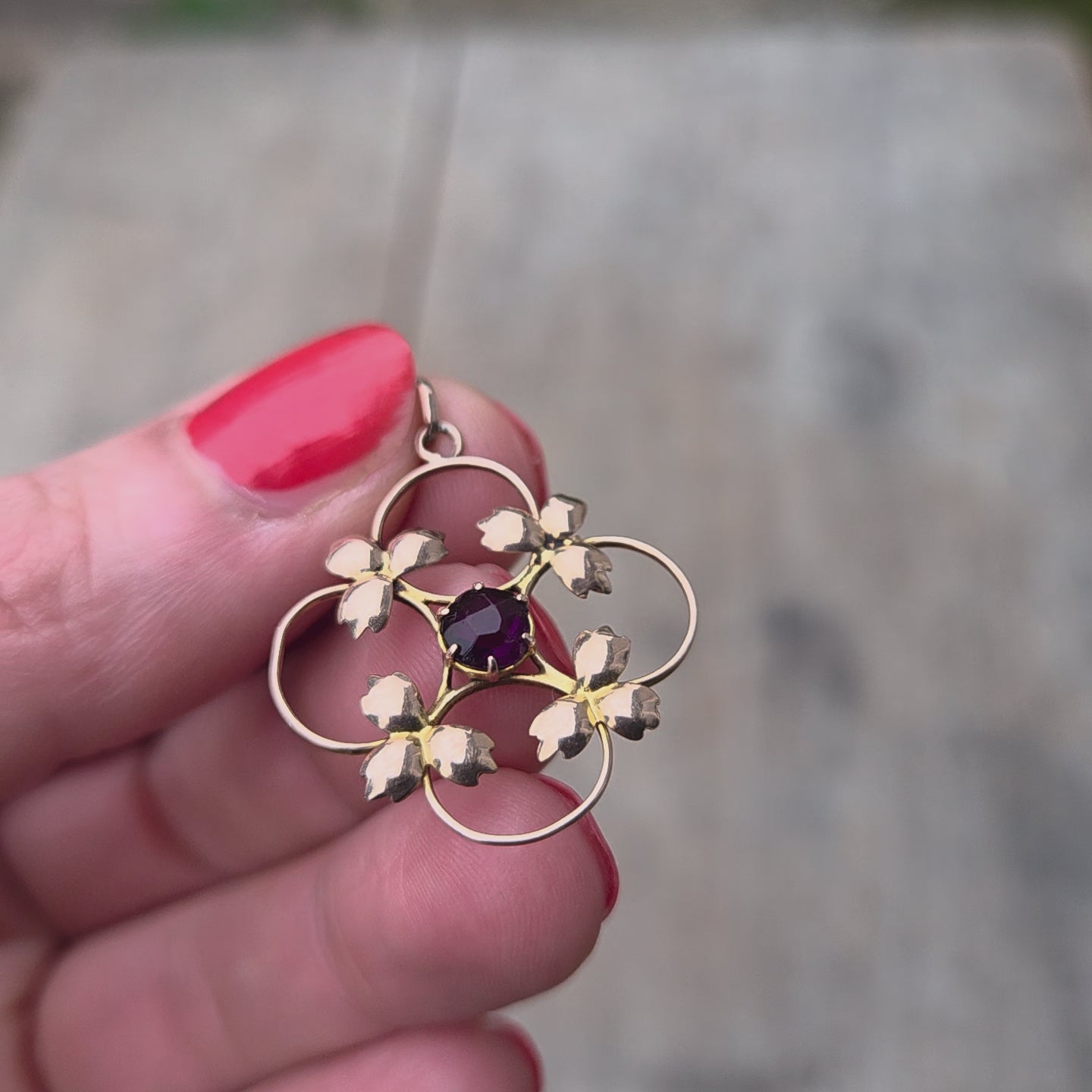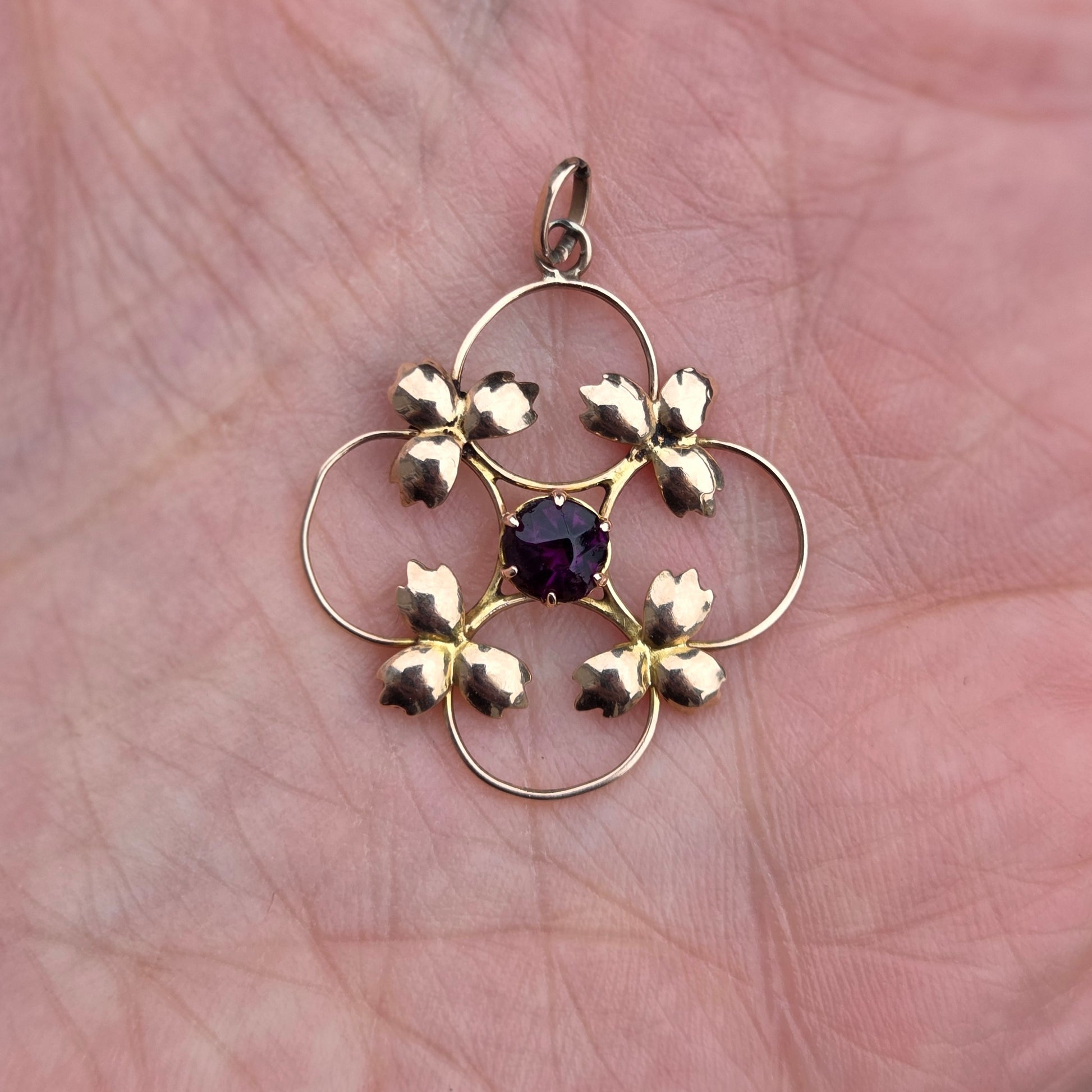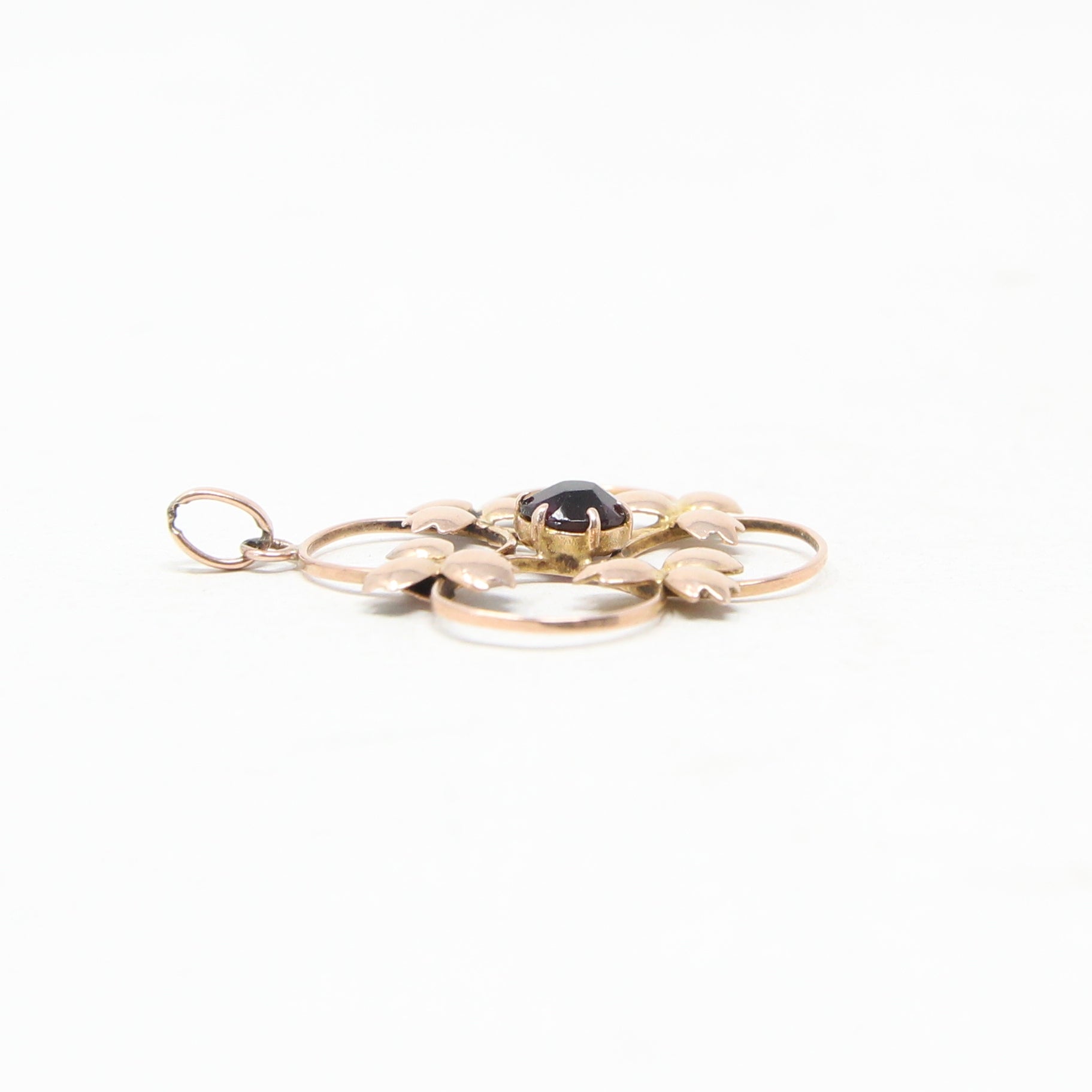 Antique Edwardian English hallmarked solid 9ct rose gold amethyst lavalier pendant.