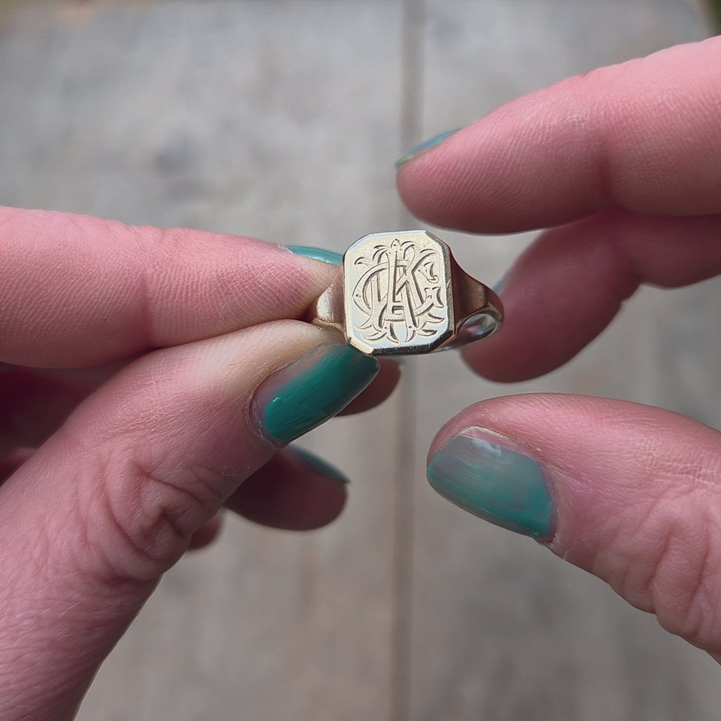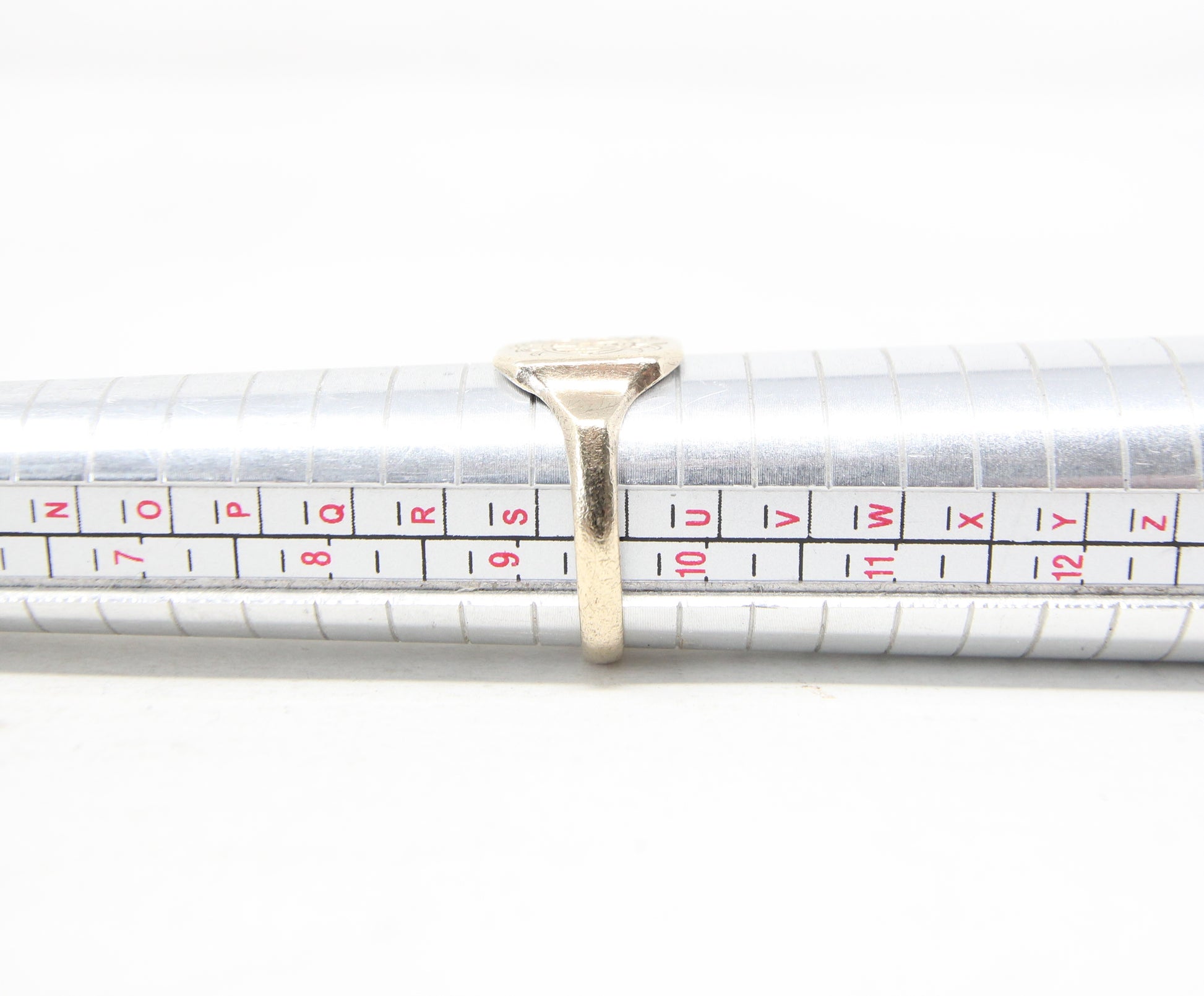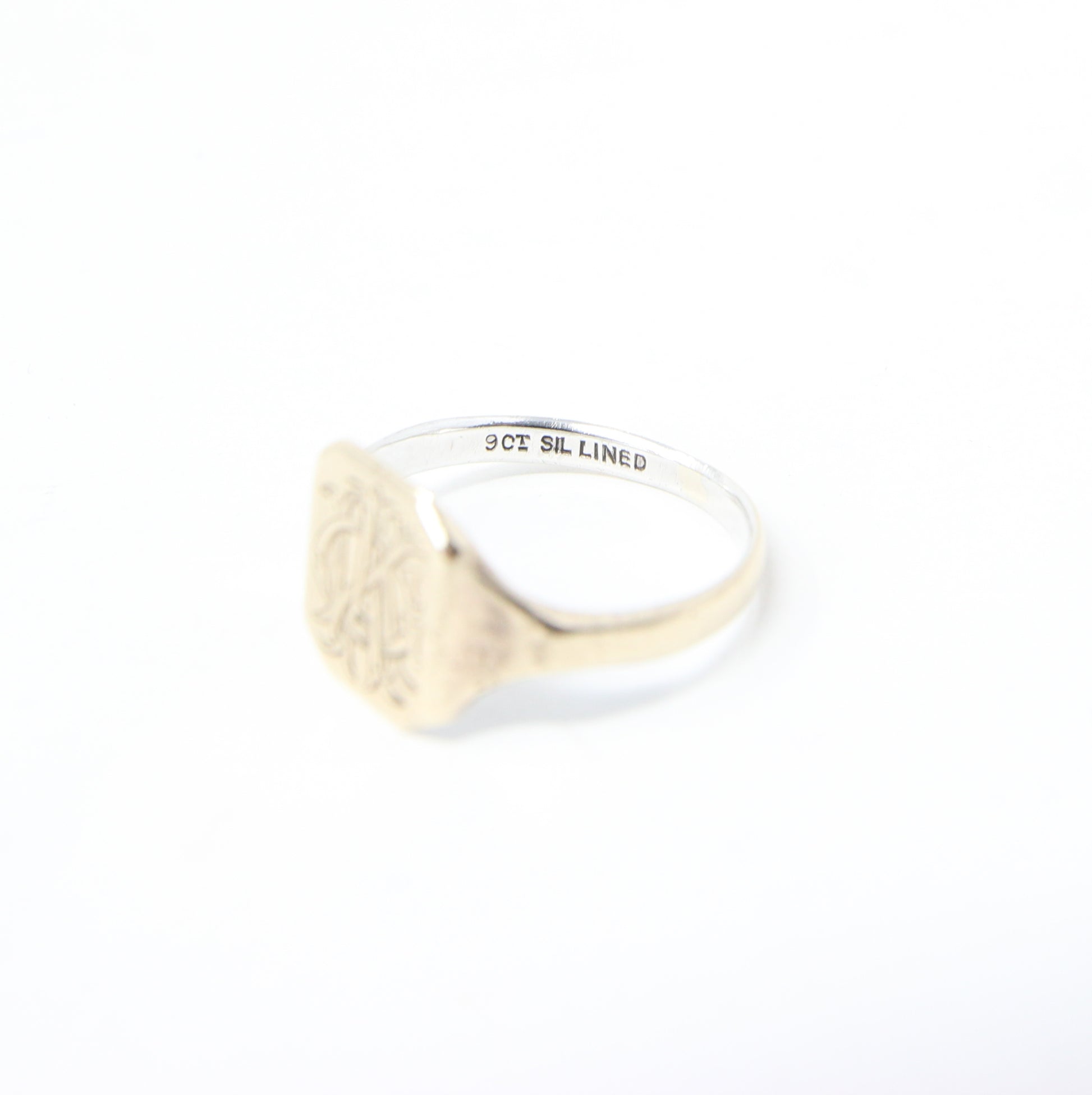 Antique Victorian solid 9ct gold silver lined monogram signet ring in a size T.