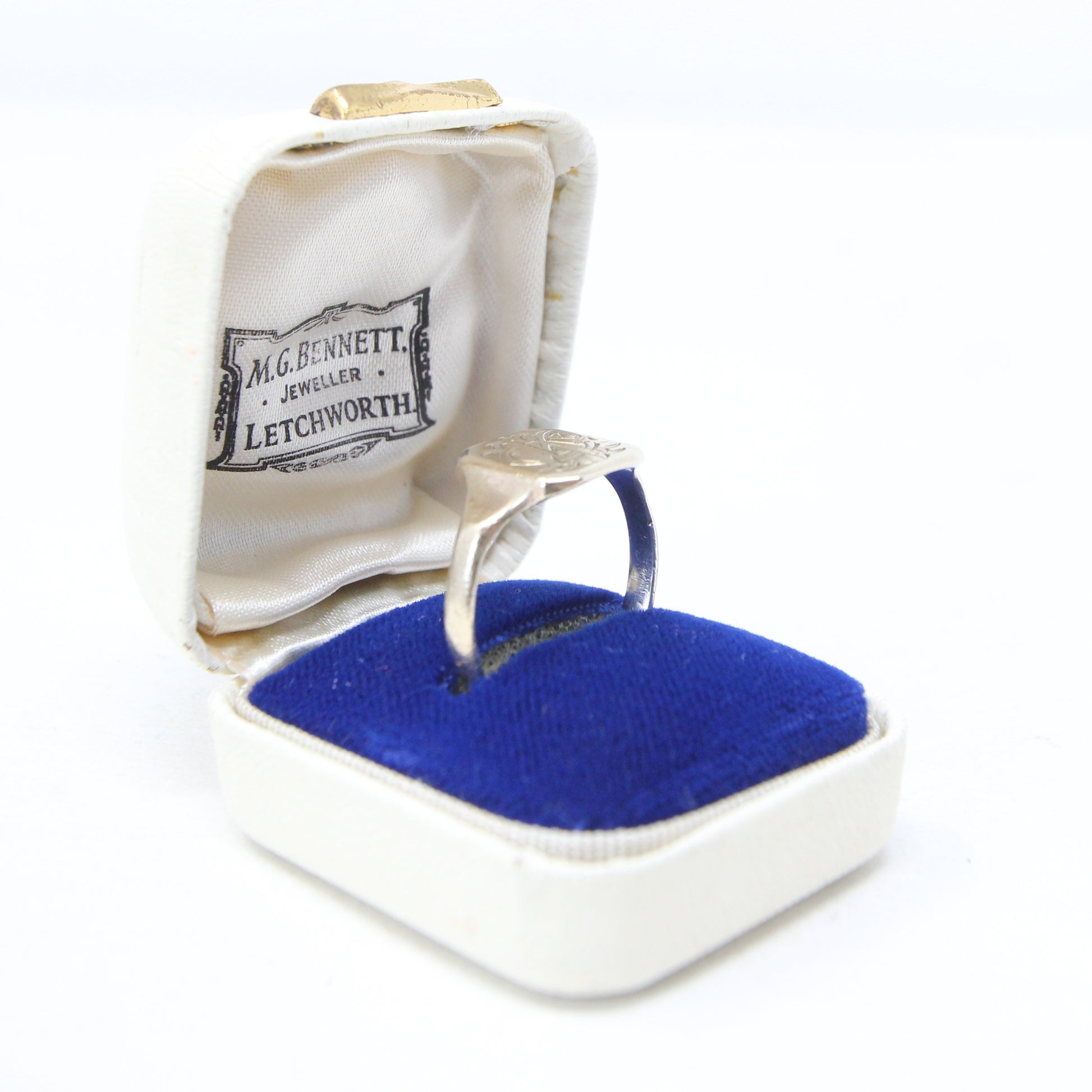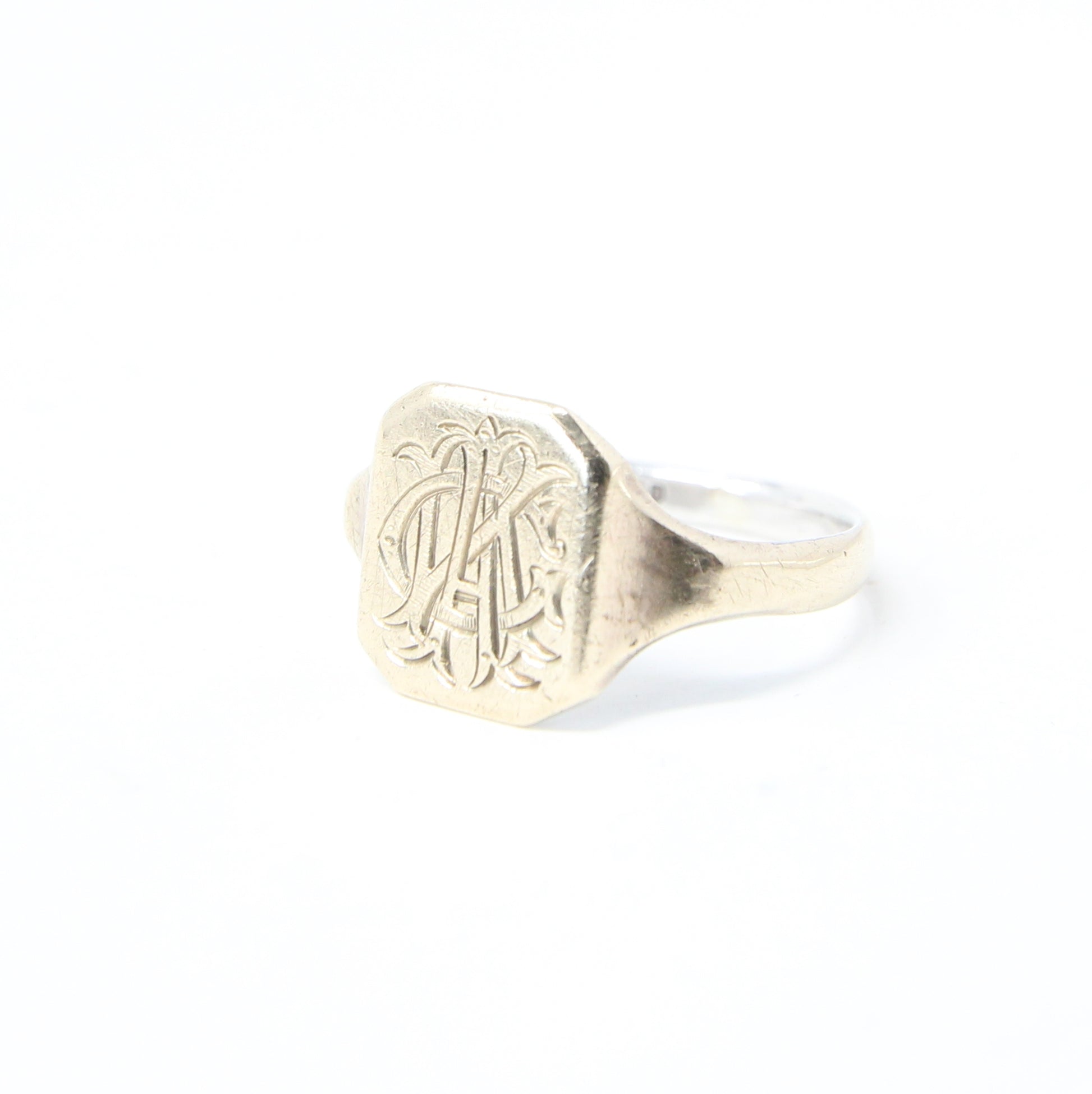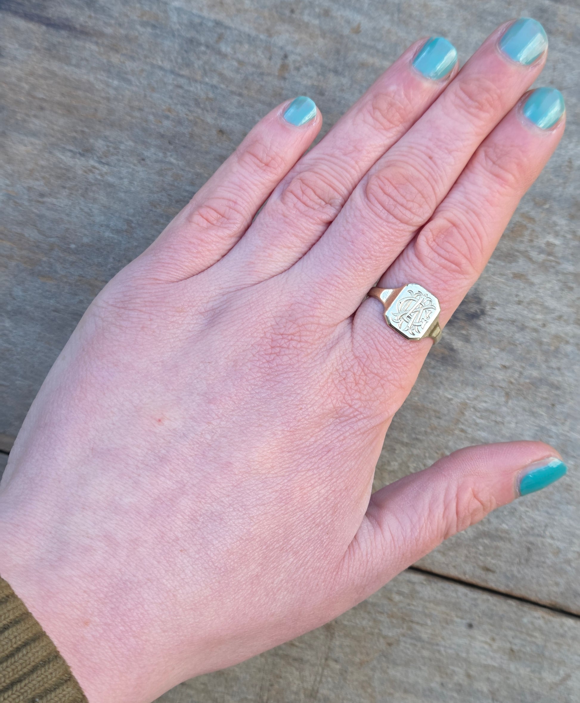 Antique Victorian solid 9ct gold silver lined monogram signet ring in a size T.