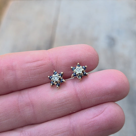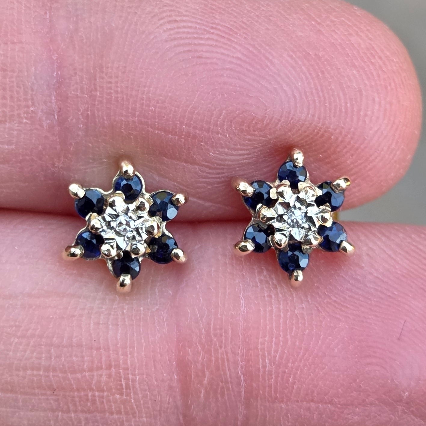 Vintage 1984 hallmarked solid 9ct gold diamond & sapphire star stud earrings.