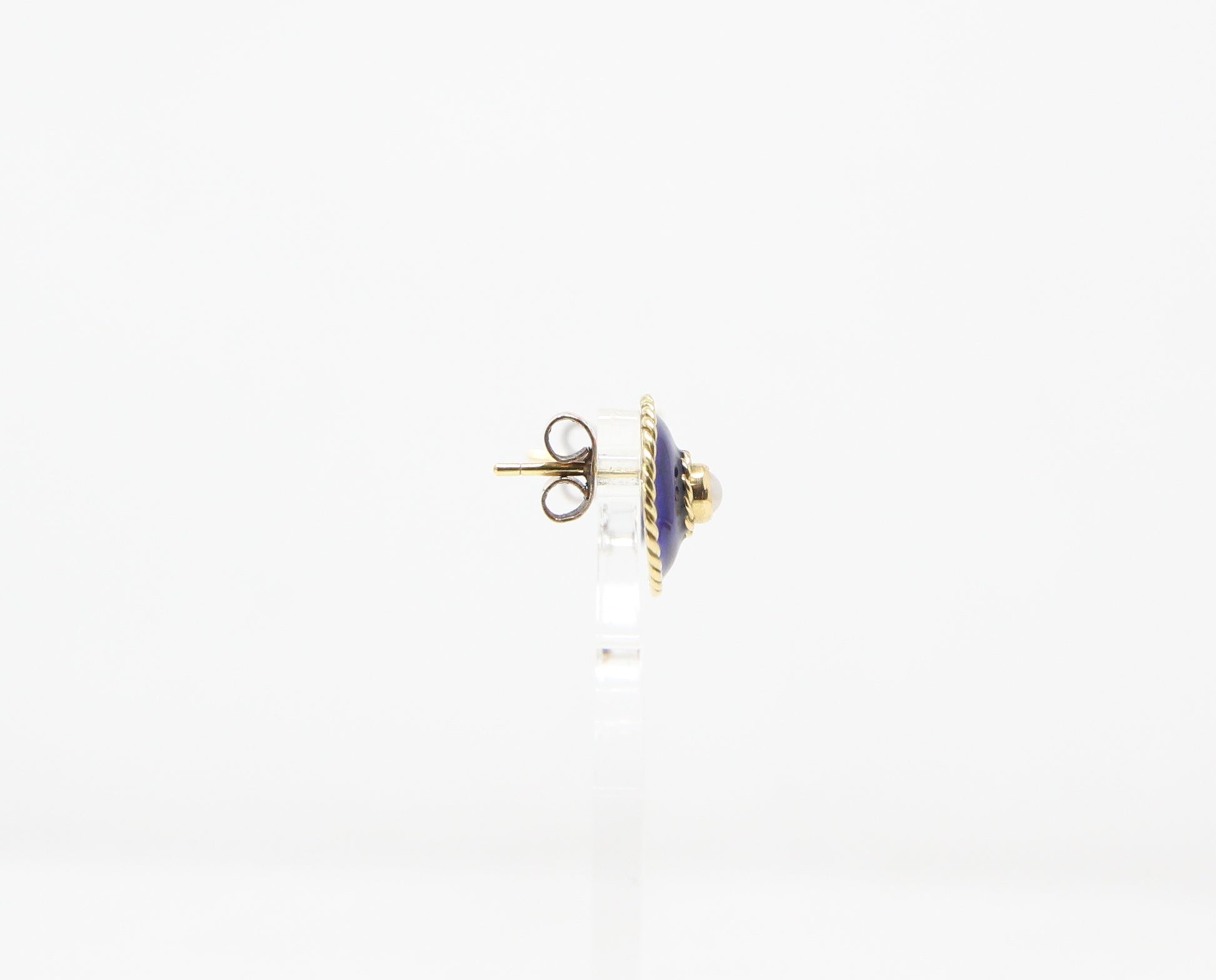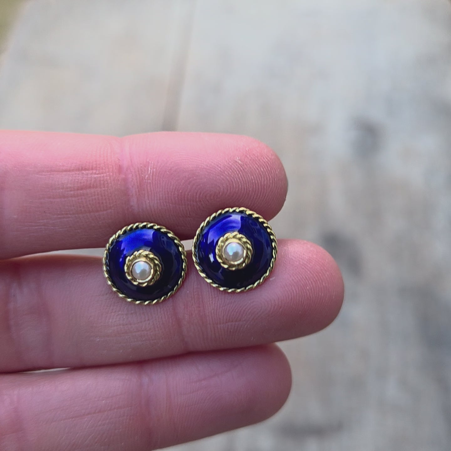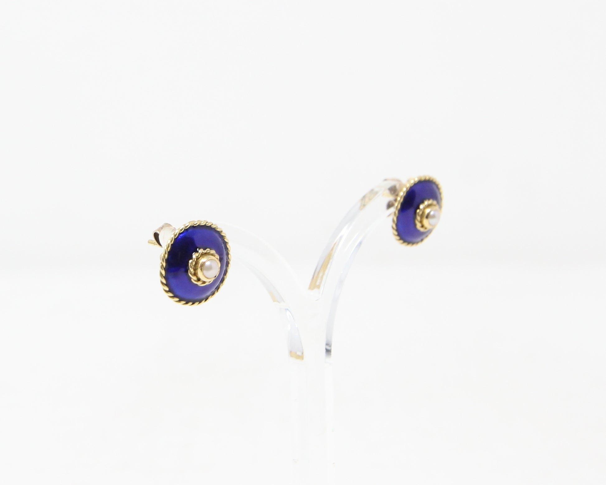 Vintage 1994 hallmarked solid 18ct gold blue enamel & pearl stud earrings.