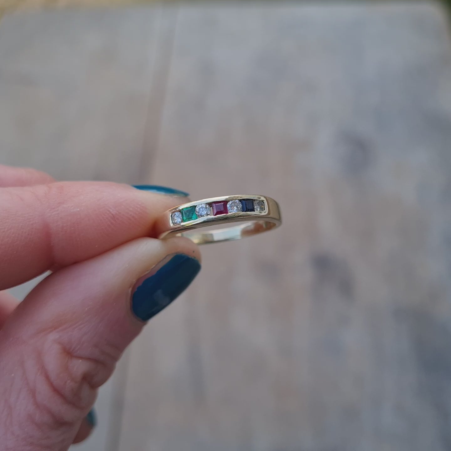 Vintage Solid 14ct 14k Gold Diamond Sapphire Ruby Emerald Half Eternity Ring Size P